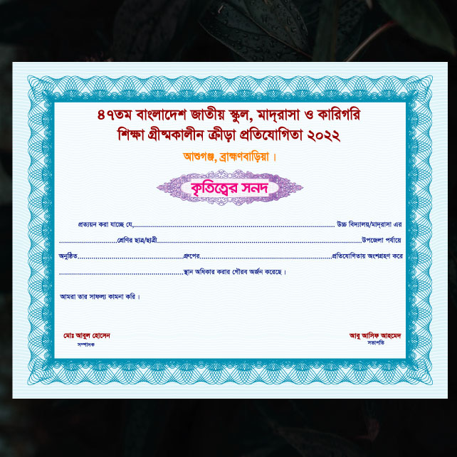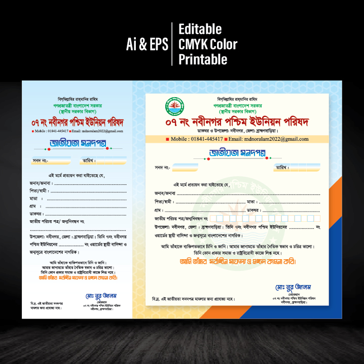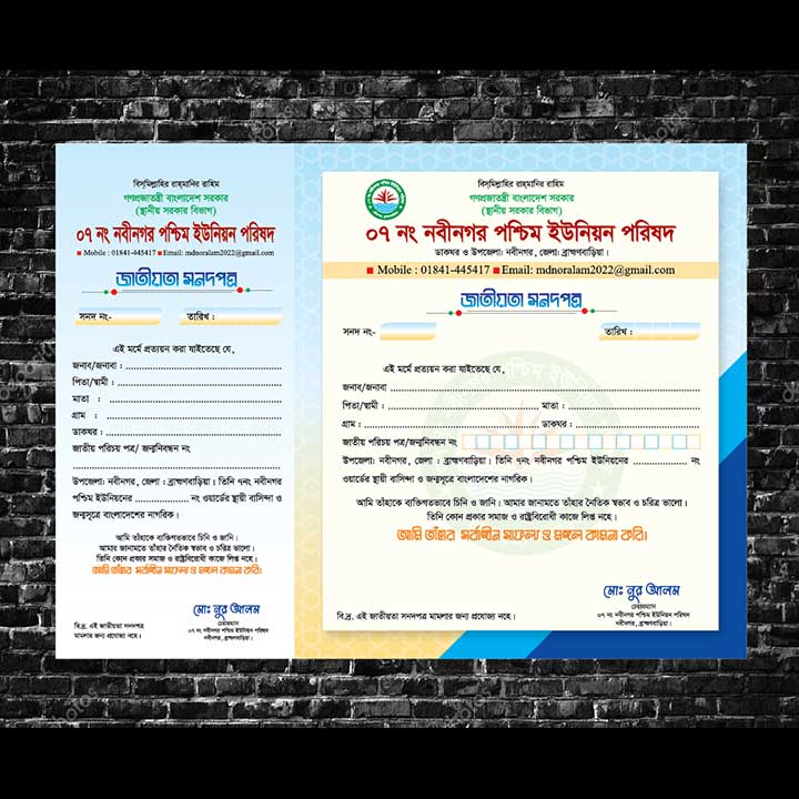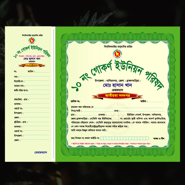 চেয়ারম্যান সার্টিফিকেট ডিজাইন, যা ইউনিয়ন পরিষদের জন্য করা হয়েছে।